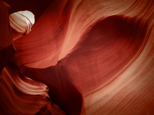 Antelope Canyon | ArizonaKdyž jsem uprostřed Arizonské pustiny sestoupil do několik metrů hluboké skalní štěrbiny, nechtěl jsem uvěřit tomu co vidím. Neskutečná hra světel a stínů rudě zbarveného kaňonu bere dech. Dokonalé umělecké dílo má na svědomí říčka Antelope Creek, která si našla svojí cestu skrz blok zkamenělé duny písku. Asi 800 metrů dlouhý kaňon je tak úzký, že v něm nerozpažíte. Popravdě jsem to ani nezkoušel, protože jsem v kuse mačkal spoušť fotoaparátu. -