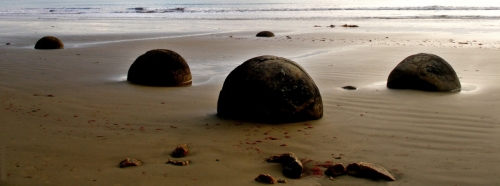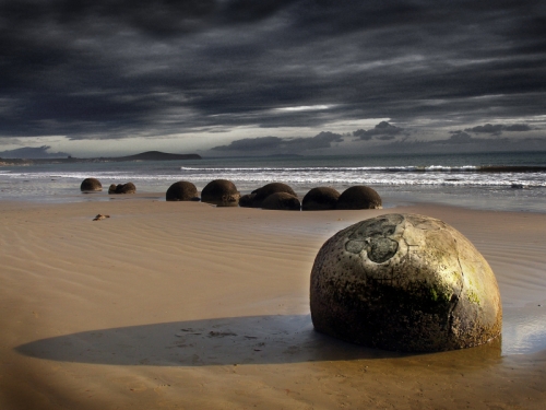 Moeraki Boulders | Nový ZélandTéměř dokonale kulaté balvany s obvodem až 4 metry se jen tak válí na pobřeží Jižního ostrova. Spousta jich je určitě ještě skryta v okolních písečných dunách. Některé z nich jsou napůl obnaženy a některé prý byly odveženy pro zkrášlení zahrad místních obyvatel. -