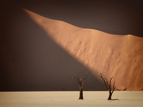 Dead vlei | NamibieZvláštní místo uprostřed červených dun namibijské pouště – “mrtvé údolí”. Přes 900 let staré akácie, zde prohráli svůj boj s drsnými klimatickými podmínkami. Desítky solitér mrtvých stromů, zčernalých od každodenního intenzivního slunečního záření dávají tušit, že tu kdysi bylo zelené údolí. Dřevo je tak vyschlé a okolní podmínky tak neměnné, že nedochází k žádnému rozkladu. A tak toto pietní místo zůstane “mumifikováno” až do doby než se sem opět vrátí voda, tedy život. -