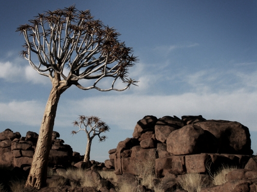 Quiver tree | NamibieStromy stejně zvláštního vzhledu, jako krajina ve které rostou. Původní obyvatelé Namibie – Křováci dělali z dutých větví tohoto stromu toulce pro své šípy. Dnes je tento rostlinný druh ohrožen klimatickými změnami. -