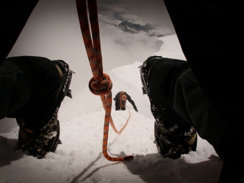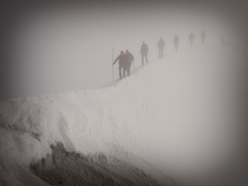 Grossvenediger | RakouskoSnad jediný okamžik kdy jste na horách rádi za špatnou viditelnost. Po obou stranách úzkého vrcholového hřebene je téměř kolmý sráz do údolí. Lepší nic nevidět. -
