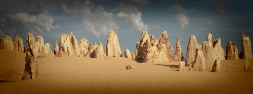Pinnacles | AustrálieZajímavě vypadající žlutý les vápencových věží. To jsou Pinnacles v západní Austrálii. Pinnacles jsou tvořeny z ulit kdysi bohaté mořské fauny. Proces vzniku není přesně znám a je předmětem diskusí. Předpokládá se, že určitou roli při vzniku Pinnacles hráli i rostliny a jejich kořeny. -