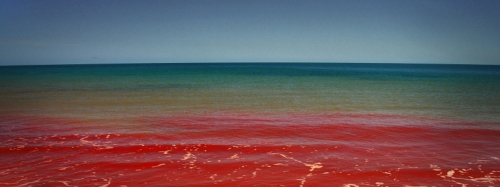 Severní pobřeží | AustrálieŽelezem zbarvená půda na australském pobřeží je omývána fantasticky modrým Indickým oceánem. Vody se mísí a jedna barva postupně přechází ve druhou. -