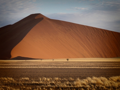 Sossusvlei | NamibieOblast v namibijské poušti známá svými červenými písečnými dunami. Duny jsou zde jedny z největších na světě. Byla to nádhera pozorovat měnící se barvy při zapadajícím slunci, sedět na vyhřáté zemi a poslouchat místní “namibijské” cvrčky. Místní cvrčci nejsou jediným pokladem ukrytým v zemi. Dříve se nedaleko odsud v písku nacházely diamanty. Dnes jsou tam nepřístupné těžařské lokality. -
