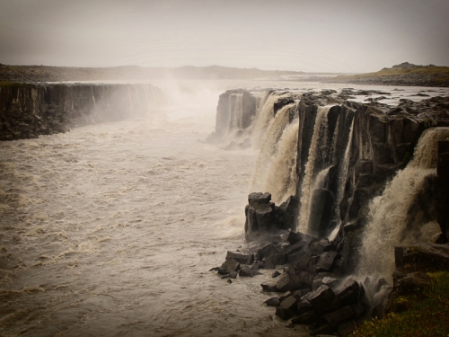 Vodopád Selfoss | IslandDravá řeka padající přes vodopád Selfoss je napájena z největšího Islandského ledovce Vatnajokull. Množství vody v řece je závislé na sopečné aktivitě vzdáleného vulkánu ukrytého pod ledovcem. Pokud se vulkán probudí k činnosti, množství vody v řece může být náhle až 200 x větší. Mystická krajina v okolí vodopádu byla vytvořena povodní apokalyptických rozměrů. -